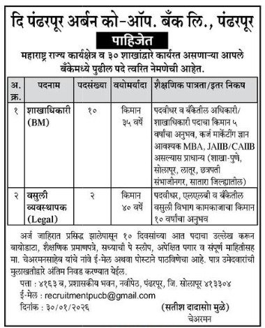 “जय महाराष्ट्र” मित्रांनो “सूचना कट्टा” या मराठी जॉब अपडेट्स वेबसाईट वरती आपले स्वागत आहे . चला तर मित्रांनो आज च्या नवीन भरती बद्दल संपूर्ण माहिती बघू या . हि भरती “दि पंढरपूर अर्बन को-ऑप. बँक लि. सोलापूर भरती २०२६.“ अंतर्गत सुरु झालेली आहे व हि शाखा व्यवस्थापक आणि वसुली व्यवस्थापक (कायदेशीर). रिक्त पदांसाठी होत आहे . हि नौकरी मिळवण्याची एक उत्तम संधी आहे. या भरती साठी अर्ज करायचा व कोण कोणते कागदपत्रे/प्रमाणपत्रे आवशक असणार आहेत या बद्दल संपूर्ण माहिती खाली दिलेली आहे व अधिक माहिती साठी pdf जाहिरातीची file लिंक सुद्धा दिलेली आहे त्या करिता संपूर्ण माहिती सविस्तर पद्धतीने वाचून घ्यायची आहे .या भरतीसाठी अर्ज प्रक्रिया पूर्णपणे ऑफलाईन असणार आहे. उमेदवारांना अर्जाचा नमुना भरून आवश्यक कागदपत्रांसह तो प्रत्यक्ष किंवा पोस्टाद्वारे संबंधित कार्यालयात सादर करावा लागेल. अर्जातील सर्व माहिती स्पष्ट व अचूक भरलेली असावी.